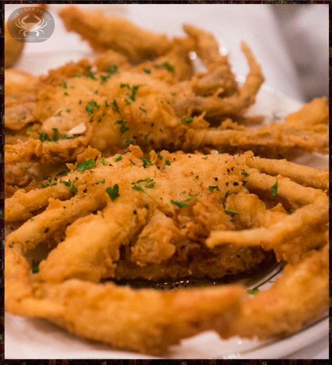 (12) Jumbo Blue Crab Soft Shells (5”-5.5”), Corn Flour Dusted [flash-frozen]. Arrives in a custom seafood cooler with an exact amount of dry ice for the trip to your destination.